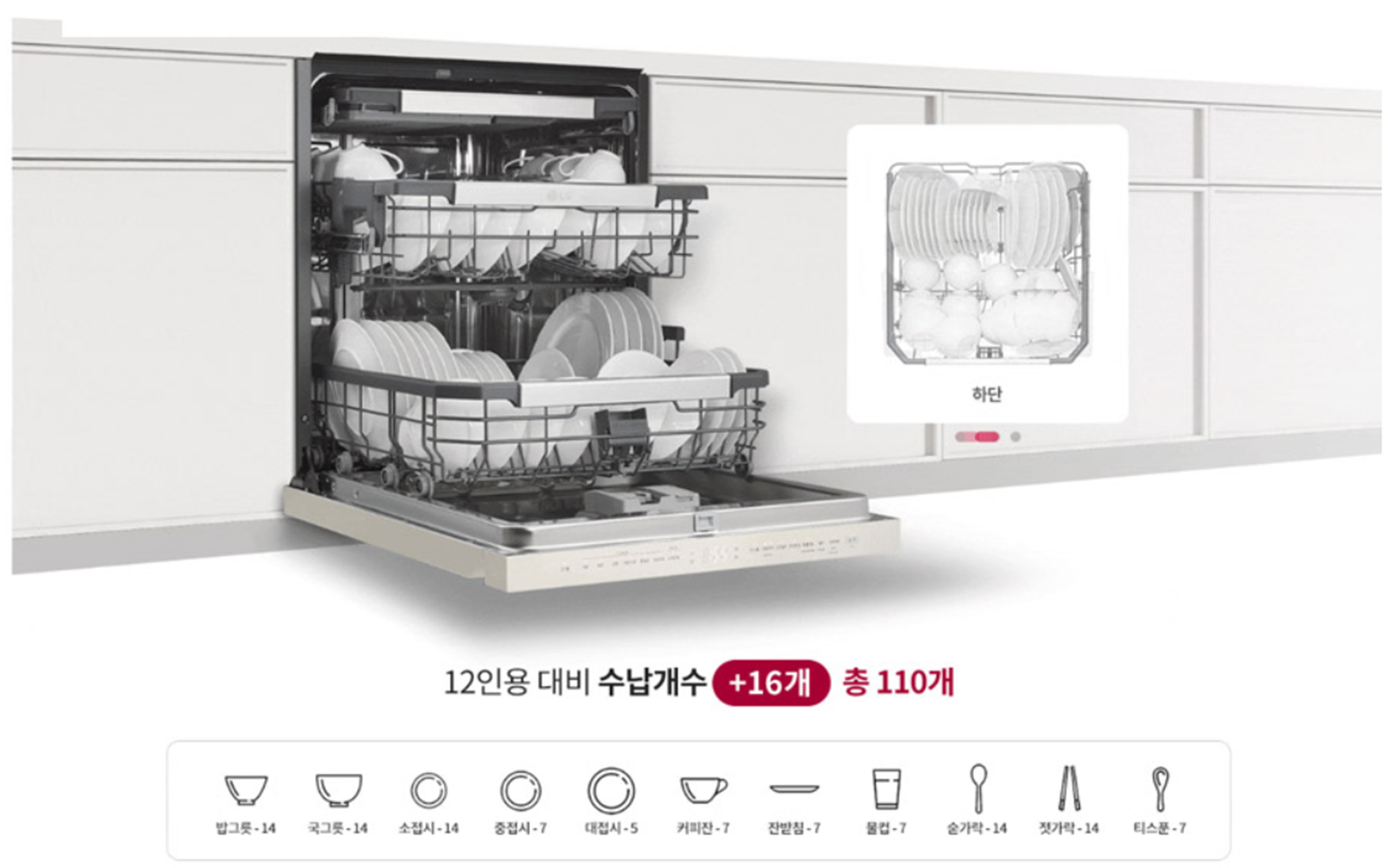 그림 5는 3인 가족으로 2일 치 설거지 분량을 넣은 것으로 식기를 많이 사용하지 않는 편이었고 그림 6과 같이 3~5인 가구도 충분히 가능하다고 되어있음. (다만 위 이미지는 12인용이라고 되어 있는데 14인용임. 이미지 업데이트가 안된듯함)